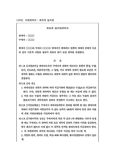계속적 상거래계약서 양식, 주요내용 : 물품공급방법, 변제, 지연손해금, 기한이익의 상실, 유효기간, 계약해지 등 내용 기재 . 단 무단전재 방지목적으로 PDF 파일로 올리니, 구매하신 후 혹 원본 파일이 필요하신 분들은 톡이나 문자, 메일, 전화 등을 주시면 작성방법 등에 대한 간단한 무료상담과 함께 원본 파일을 보내드리도록 하겠습니다.