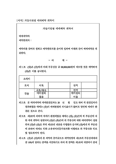 가등기설정 매매예약 계약서 양식, 주요내용 : 매매예약, 완결일, 대금수령 방법, 증거금, 소유권이전등기 등 내용 기재 . 단 무단전재 방지목적으로 PDF 파일로 올리니, 구매하신 후 혹 원본 파일이 필요하신 분들은 톡이나 문자, 메일, 전화 등을 주시면 작성방법 등에 대한 간단한 무료상담과 함께 원본 파일을 보내드리도록 하겠습니다.