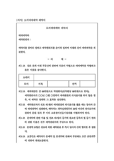 토지매매예약 계약서 양식, 주요내용 : 대상부동산표기, 대금,예약환결의사표시 기한, 소유권이전등기절차, 제세공과금 부담 등 내용 기재. 단 무단전재 방지목적으로 PDF 파일로 올리니, 구매하신 후 혹 원본 파일이 필요하신 분들은 톡이나 문자, 메일, 전화 등을 주시면 작성방법 등에 대한 간단한 무료상담과 함께 원본 파일을 보내드리도록 하겠습니다.