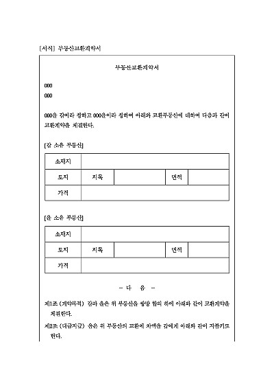 부동산교환계약서 양식, 주요내용 : 교환대상 부동산표시, 교환대급지급방법, 평가액, 권리이전, 제세공과금 부담방법, 계약해제, 소유권이전등기 및 인도시기 등 내용 기재. 단 무단전재 방지목적으로 PDF 파일로 올리니, 구매하신 후 혹 원본 파일이 필요하신 분들은 톡이나 문자, 메일, 전화 등을 주시면 작성방법 등에 대한 간단한 무료상담과 함께 원본 파일을 보내드리도록 하겠습니다.