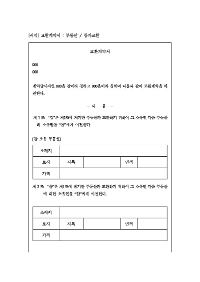 교환계약서, 등가교환 양식, 주요내용 : 대상부동산 표시, 차액없는 등가 교환, 비용 각자 부담 . 단 무단전재 방지목적으로 PDF 파일로 올리니,구매하신 후 혹 원본 파일이 필요하신 분들은 톡이나 문자, 메일, 전화 등을 주시면 작성방법 등에 대한 간단한 무료상담과 함께 원본 파일을 보내드리도록 하겠습니다.