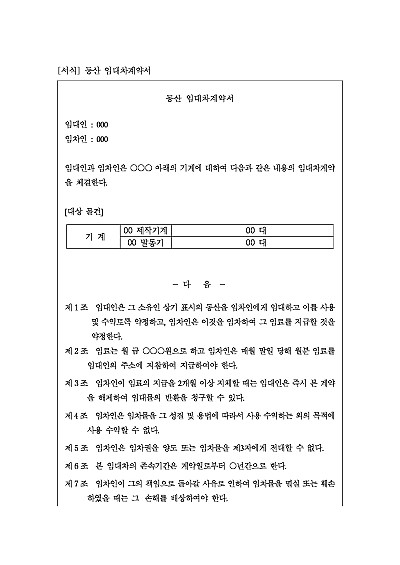 동산임대차계약서 양식, 주요내용 : 임료, 계약해지, 목적외 사용금지, 전대 등 금지, 계약기간, 멸실 등 손배 등 내용 기재. 단 무단전재 방지목적으로 PDF 파일로 올리니, 구매하신 후 혹 원본 파일이 필요하신 분들은 톡이나 문자, 메일, 전화 등을 주시면 작성방법 등에 대한 간단한 무료상담과 함께 원본 파일을 보내드리도록 하겠습니다.