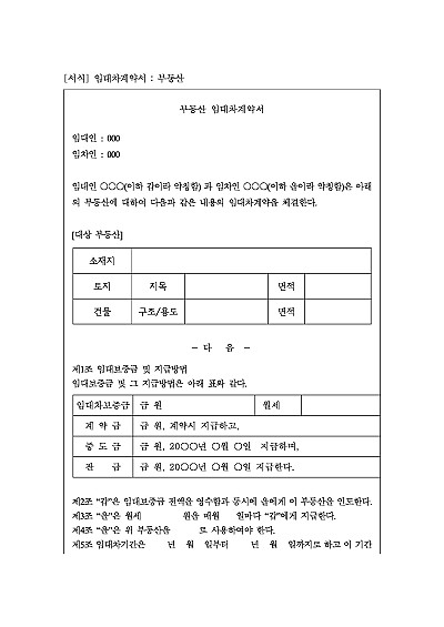 부동산임대차계약서 양식, 주요내용 : 보증금 및 월세 지급방법, 부동산인도 시기, 임대차기간, 사용목적, 젼대 등 금지, 목적외 사용등 계약해지, 위약금 등 내용 기재. 단 무단전재 방지목적으로 PDF 파일로 올리니, 구매하신 후 혹 원본 파일이 필요하신 분들은 톡이나 문자, 메일, 전화 등을 주시면 작성방법 등에 대한 간단한 무료상담과 함께 원본 파일을 보내드리도록 하겠습니다.