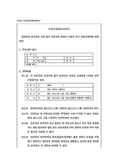 부동산임대차계약서 양식, 주요내용 : 계약내용, 임대차기간, 목적물 인도, 전대 등 금지, 계약해지(중도금지급전), 중개보수 쌍방 지급 등 내용 기재, 단 무단전재 방지목적으로 PDF 파일로 올리니, 구매하신 후 혹 원본 파일이 필요하신 분들은 톡이나 문자, 메일, 전화 등을 주시면 작성방법 등에 대한 간단한 무료상담과 함께 원본 파일을 보내드리도록 하겠습니다.