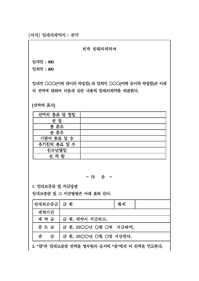 선박임대차계약서 양식, 주요내용 : 선박의 표시, 임대보증금 등 지급방법, 선박인도시기, 임대차기간, 전대/구조변경 등 금지, 계약해지 사유, 위약금, 선박인도시 손해금 공제 등 내용 기재, 단 무단전재 방지목적으로 PDF 파일로 올리니, 구매하신 후 혹 원본 파일이 필요하신 분들은 톡이나 문자, 메일, 전화 등을 주시면 작성방법 등에 대한 간단한 무료상담과 함께 원본 파일을 보내드리도록 하겠습니다.