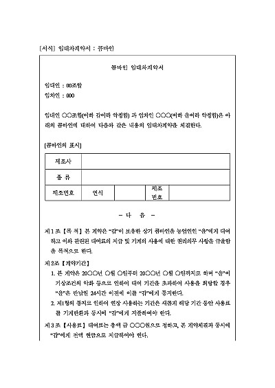 콤바인임대차계약서 양식, 주요내용 : 대여기간, 사용료, 사용목적, 인도, 검수, 반환, 계약해지 등 내용 기재. 단 무단전재 방지목적으로 PDF 파일로 올리니, 구매하신 후 혹 원본 파일이 필요하신 분들은 톡이나 문자, 메일, 전화 등을 주시면 작성방법 등에 대한 간단한 무료상담과 함께 원본 파일을 보내드리도록 하겠습니다.