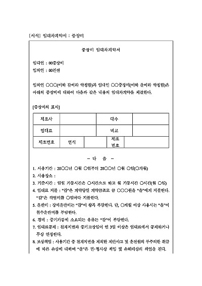 중장비임대차계약서 양식, 주요내용 : 사용기간, 사용장소, 기준시간, 임대료지급, 운반비, 경비, 보상책임, 계약갱신, 계약해지 등 내용 기재. 단 무단전재 방지목적으로 PDF 파일로 올리니, 구매하신 후 혹 원본 파일이 필요하신 분들은 톡이나 문자, 메일, 전화 등을 주시면 작성방법 등에 대한 간단한 무료상담과 함께 원본 파일을 보내드리도록 하겠습니다.