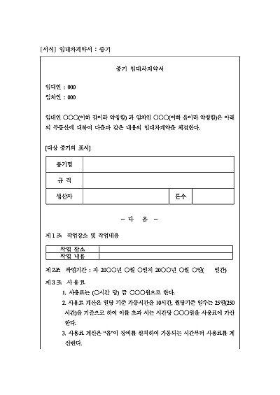 중기임대차계약서 양식, 주요내용 : 작업장소, 작업내용, 기간, 사용료, 수송비, 기타 경비부담, 안전사고 책임, 목적외 사용금지 등 내용 기재. 단 무단전재 방지목적으로 PDF 파일로 올리니, 구매하신 후 혹 원본 파일이 필요하신 분들은 톡이나 문자, 메일, 전화 등을 주시면 작성방법 등에 대한 간단한 무료상담과 함께 원본 파일을 보내드리도록 하겠습니다.