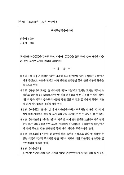 도서무상사용계약서 양식, 주요내용 : 무상대여 도서 목록, 이용일, 열쇠보관, 청소관리, 사용범위, 보고의무, 선관의무, 계약해지 등 내용 기재. 단 무단전재 방지목적으로 PDF 파일로 올리니구매하신 후 혹 원본 파일이 필요하신 분들은 톡이나 문자메일전화 등을 주시면 작성방법 등에 대한 간단한 무료상담과 함께 원본 파일을 보내드리도록 하겠습니다.