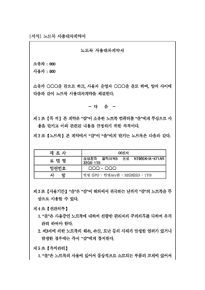 노트북 사용대차계약서 양식, 주요내용 : 대상 노트북 특정, 사용기간, 선관의무, 유지관리, 양도금지, 사용금지, 분실고장 등 내용 기재. 단 무단전재 방지목적으로 PDF 파일로 올리니, 구매하신 후 혹 원본 파일이 필요하신 분들은 톡이나 문자, 메일, 전화 등을 주시면 작성방법 등에 대한 간단한 무료상담과 함께 원본 파일을 보내드리도록 하겠습니다.