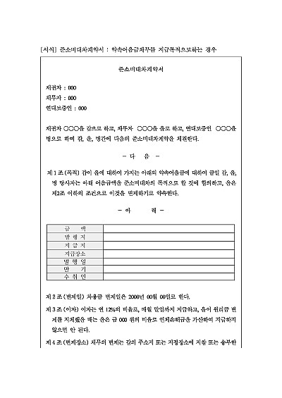 준소비대차계약서, 약속어음금채무를 지급목적으로 하는 경우, 주요내용 : 변제일, 이자, 변제장소, 기한의 이익상실, 보증책임 등 내용 기재. 단 무단전재 방지목적으로 PDF 파일로 올리니, 구매하신 후 혹 원본 파일이 필요하신 분들은 톡이나 문자, 메일, 전화 등을 주시면 작성방법 등에 대한 간단한 무료상담과 함께 원본 파일을 보내드리도록 하겠습니다.