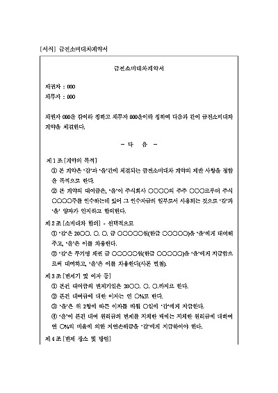 금전소비대차계약서 양식, 주요내용 : 계약의 목적, 변제기 및 변제장소 등, 기한의 이익 상실, 담보제공, 연대보증, 변제순위 등 내용 기재. 단 무단전재 방지목적으로 PDF 파일로 올리니, 구매하신 후 혹 원본 파일이 필요하신 분들은 톡이나 문자, 메일, 전화 등을 주시면 작성방법 등에 대한 간단한 무료상담과 함께 원본 파일을 보내드리도록 하겠습니다.