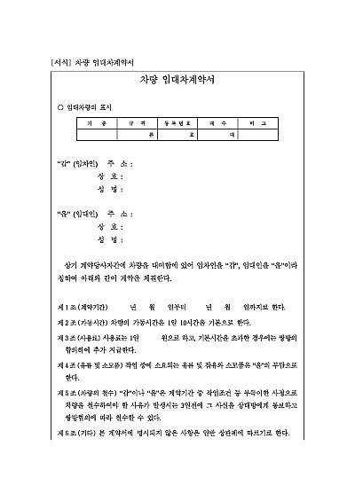차량임대차계약서 양식, 주요내용 : 계약기간, 가동시간, 사용료, 유류 및 소모품, 차량의 철수 등 내용 기재. 단 무단전재 방지목적으로 PDF 파일로 올리니, 구매하신 후 혹 원본 파일이 필요하신 분들은 톡이나 문자, 메일, 전화 등을 주시면 작성방법 등에 대한 간단한 무료상담과 함께 원본 파일을 보내드리도록 하겠습니다.