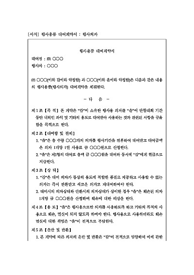 행사의자 사용계약서 양식, 주요내용 : 수량 및 결제방법, 상태, 용도, 운반 및 반환, 대여기간, 상태확인 등 내용 기재. 단 무단전재 방지목적으로 PDF 파일로 올리니, 구매하신 후 혹 원본 파일이 필요하신 분들은 톡이나 문자, 메일, 전화 등을 주시면 작성방법 등에 대한 간단한 무료상담과 함께 원본 파일을 보내드리도록 하겠습니다.