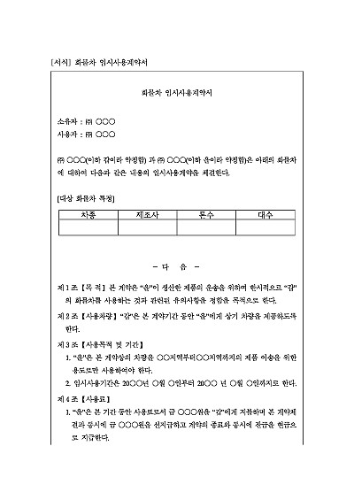 화물차 일시사용계약서 양식, 주요내용 : 사용목적 및 기간, 사용료, 차량제공, 안의의무, 차량훼손에 따른 책임, 양도금지, 계약해지 등 내용 기재. 단 무단전재 방지목적으로 PDF 파일로 올리니, 구매하신 후 혹 원본 파일이 필요하신 분들은 톡이나 문자, 메일, 전화 등을 주시면 작성방법 등에 대한 간단한 무료상담과 함께 원본 파일을 보내드리도록 하겠습니다.