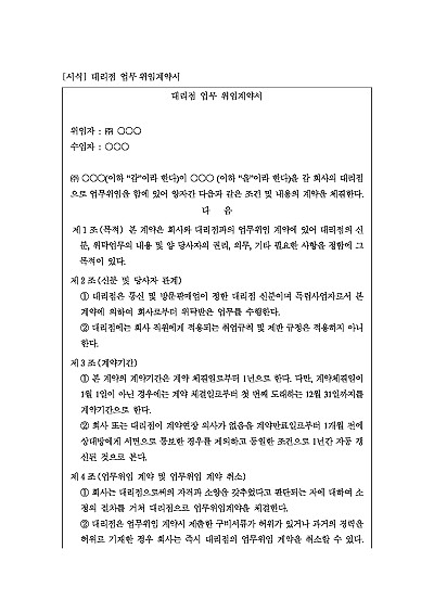 주요내용 : 신분 및 당사자 관계, 계약기간, 위임계약 및 업무취소, 위탁업무, 대리점 준수사항, 계약내용의 변경, 수수료의 지급, 상품관련 교육, 위탁업무 일시중지, 재정보증, 손해배상, 조세부담, 계약의 효력발생 등 내용 기재 . 단 무단전재 방지목적으로 PDF 파일로 올리니, 구매하신 후 혹 원본 파일이 필요하신 분들은 톡이나 문자, 메일, 전화 등을 주시면 작성방법 등에 대한 간단한 무료상담과 함께 원본 파일을 보내드리도록 하겠습니다.