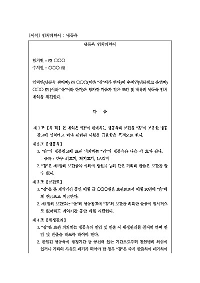 주요내용 : 대상 내동육, 보관료, 위생관리, 냉동창고 관리, 계약기간, 계약해지 등 내용 기재. 단 무단전재 방지목적으로 PDF 파일로 올리니구매하신 후 혹 원본 파일이 필요하신 분들은 톡이나 문자메일전화 등을 주시면 작성방법 등에 대한 간단한 무료상담과 함께 원본 파일을 보내드리도록 하겠습니다.