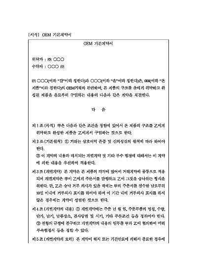 주요내용 : 개별계약 및 효력, 사용법, 상표 및 상표보증, 납품전 조사,납품, 납기, 수입검사, 소유권이전, 위험부담, 대금지급, AS, 제조물책딤, 공업소유권의 실시 및 출원, 비밀유지, 생산중단, 계약유효기간 및 계약해지, 기한의 이익상실 등 내용 기재. 단 무단전재 방지목적으로 PDF 파일로 올리니, 구매하신 후 혹 원본 파일이 필요하신 분들은 톡이나 문자, 메일, 전화 등을 주시면 작성방법 등에 대한 간단한 무료상담과 함께 원본 파일을 보내드리도록 하겠습니다.