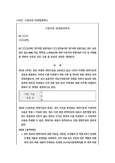 주요내용 : 대상기술, 계약기술의 특징, 용역제공 및 보수 등 면책, 상호협조, 비밀유지, 계약의 효력 및 계약의 효력 . 단 무단전재 방지목적으로 PDF 파일로 올리니, 구매하신 후 혹 원본 파일이 필요하신 분들은 톡이나 문자, 메일, 전화 등을 주시면 작성방법 등에 대한 간단한 무료상담과 함께 원본 파일을 보내드리도록 하겠습니다.
