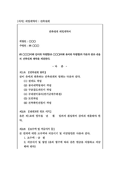 주요내용 : 위임범위, 설계도면 인도시기, 보수액 및 지급시기 등 등 내용기재, 단 무단전재 방지목적으로 PDF 파일로 올리니, 구매하신 후 혹 원본 파일이 필요하신 분들은 톡이나 문자, 메일, 전화 등을 주시면 작성방법 등에 대한 간단한 무료상담과 함께 원본 파일을 보내드리도록 하겠습니다.