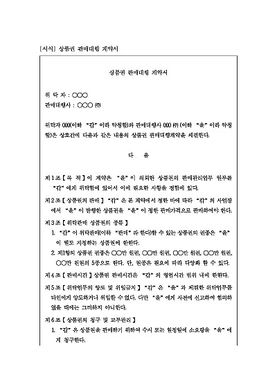 주요내용 : 위탁판매 상품권 종류, 판매시간, 위임금지, 상품권의 청구 및 교부 관리, 교부된 상품권에 대한 책임, 판매대행 수수료, 매대금의 납입, 고객분쟁 책임 및 상계. 계약해지 사유, 대행판매금액 제한, 계약기간 등 내용 기재. 단 무단전재 방지목적으로 PDF 파일로 올리니, 구매하신 후 혹 원본 파일이 필요하신 분들은 톡이나 문자, 메일, 전화 등을 주시면 작성방법 등에 대한 간단한 무료상담과 함께 원본 파일을 보내드리도록 하겠습니다.