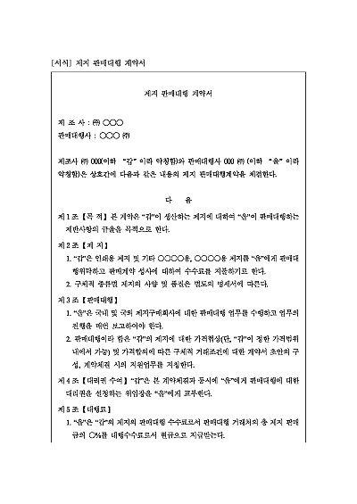 주요내용 : 대리권 수여, 대행료, 서면보고, 비밀유지, 가격조정 금지, 계약기간 및 해지 사유 등 내용 기재 . 단 무단전재 방지목적으로 PDF 파일로 올리니, 구매하신 후 혹 원본 파일이 필요하신 분들은 톡이나 문자, 메일, 전화 등을 주시면 작성방법 등에 대한 간단한 무료상담과 함께 원본 파일을 보내드리도록 하겠습니다.