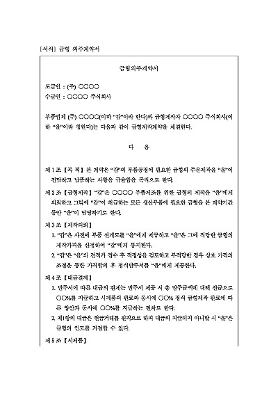주요내용 : 사양, 제금결제, 시제품, 인도, 비밀유지, 계약기간, 계약해지 사유 등 내용 기재. 단 무단전재 방지목적으로 PDF 파일로 올리니, 구매하신 후 혹 원본 파일이 필요하신 분들은 톡이나 문자, 메일, 전화 등을 주시면 작성방법 등에 대한 간단한 무료상담과 함께 원본 파일을 보내드리도록 하겠습니다.