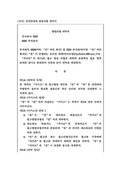 주요내용 : 갑을의 의무, 공고료 및 광고비 지급조건, 영업대행수수료, 지식재산권 소유, 계약 양도금지, 계약해지 사유, 기밀유지, 회원정보사용, 손해배상 등 내용 기재. 단 무단전재 방지목적으로 PDF 파일로 올리니, 구매하신 후 혹 원본 파일이 필요하신 분들은 톡이나 문자, 메일, 전화 등을 주시면 작성방법 등에 대한 간단한 무료상담과 함께 원본 파일을 보내드리도록 하겠습니다.