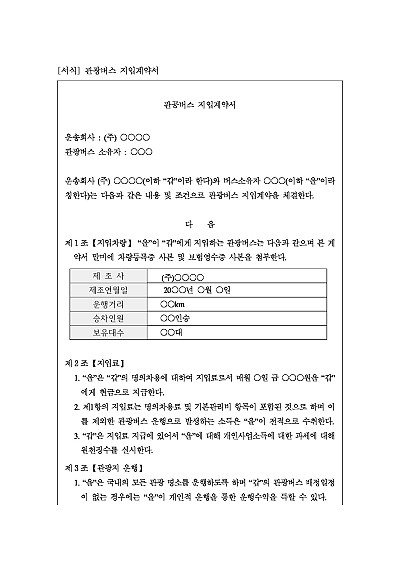 주요내용 : 지입차량 특정, 지입료, 관광지 운행, 운행책임, 차량관리, 계약해지 사유, 계약기간 등 내용 기재. 단 무단전재 방지목적으로 PDF 파일로 올리니, 구매하신 후 혹 원본 파일이 필요하신 분들은 톡이나 문자, 메일, 전화 등을 주시면 작성방법 등에 대한 간단한 무료상담과 함께 원본 파일을 보내드리도록 하겠습니다.
