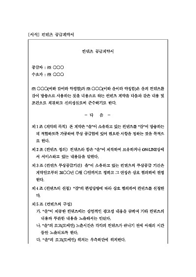 주요내용 : 컨텐츠 제공기간, 컨텐츠 선정 및 구성, 사용범위, 공급방법, 수정, 이행사항, 계약해지 사유 등 내용 기재. 단 무단전재 방지목적으로 PDF 파일로 올리니, 구매하신 후 혹 원본 파일이 필요하신 분들은 톡이나 문자, 메일, 전화 등을 주시면 작성방법 등에 대한 간단한 무료상담과 함께 원본 파일을 보내드리도록 하겠습니다.