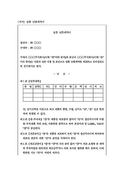 주요내용 : 발주내역, 자재공급, 견본승인, 하도급금지, 비밀유지, 검사, 불합격품처리, 상표관리, 납품, 대금결제, 손해배상, 납품불이행, 손해배상, 담보제공, 유효기간 등 내용 기재 . 단 무단전재 방지목적으로 PDF 파일로 올리니, 구매하신 후 혹 원본 파일이 필요하신 분들은 톡이나 문자, 메일, 전화 등을 주시면 작성방법 등에 대한 간단한 무료상담과 함께 원본 파일을 보내드리도록 하겠습니다.