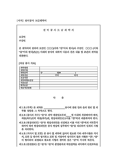 주요내용 : 공사착수, 지시서 및 도면, 안전관리, 재하도급 금지, 화재보상, 보험가입, 공사완공, 인도, 하자보수, 인가사 및 이행비용, 대금지급, 지체상금, 상계, 계약해지 사유 등 내용 기재. 단 무단전재 방지목적으로 PDF 파일로 올리니, 구매하신 후 혹 원본 파일이 필요하신 분들은 톡이나 문자, 메일, 전화 등을 주시면 작성방법 등에 대한 간단한 무료상담과 함께 원본 파일을 보내드리도록 하겠습니다.