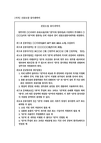 주요내용 : 공사금액, 공사기간, 자재검수,피해보상, 공사중지, 공사금액 변경, 지체상금 채권양도금지, 공사비 지급방법, 하자보수기간, 하자보증처리 등 내용 기재 . 단 무단전재 방지목적으로 PDF 파일로 올리니, 구매하신 후 혹 원본 파일이 필요하신 분들은 톡이나 문자, 메일, 전화 등을 주시면 작성방법 등에 대한 간단한 무료상담과 함께 원본 파일을 보내드리도록 하겠습니다.