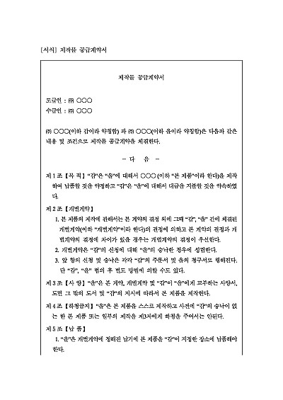 주요내용 : 제작물 사양, 납품, 하청금지, 검사 및 검수, 소유권 및 위험부담, 보증, 대금지급방법, 계약해지 사유, 유효기간 등 내용 기재. 단 무단전재 방지목적으로 PDF 파일로 올리니, 구매하신 후 혹 원본 파일이 필요하신 분들은 톡이나 문자, 메일, 전화 등을 주시면 작성방법 등에 대한 간단한 무료상담과 함께 원본 파일을 보내드리도록 하겠습니다.