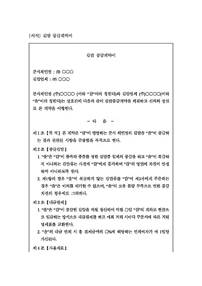 주요내용 : 대금결제, 사용재료, 신선도 등, 계약기간, 계약해지, 분쟁해결 등. 단 무단전재 방지목적으로 PDF 파일로 올리니, 구매하신 후 혹 원본 파일이 필요하신 분들은 톡이나 문자, 메일, 전화 등을 주시면 작성방법 등에 대한 간단한 무료상담과 함께 원본 파일을 보내드리도록 하겠습니다.