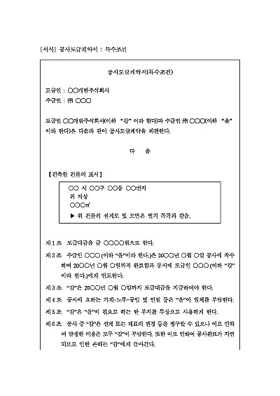 주요내용 : 대상 건축물 표시, 대금, 공사기간 및 인도시기, 대금지급, 노무 등 부담, 지연손해금 등, 하자담보책임, 손해배상 / 하자보수청구 기간 등. 단 무단전재 방지목적으로 PDF 파일로 올리니, 구매하신 후 혹 원본 파일이 필요하신 분들은 톡이나 문자, 메일, 전화 등을 주시면 작성방법 등에 대한 간단한 무료상담과 함께 원본 파일을 보내드리도록 하겠습니다.