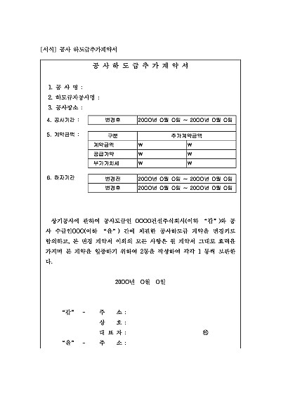 하도금계약체결 후 도급내용을 추가하는 계약을 체결할 때 사용하는 양식임. 단 무단전재 방지목적으로 PDF 파일로 올리니, 구매하신 후 혹 원본 파일이 필요하신 분들은 톡이나 문자, 메일, 전화 등을 주시면 작성방법 등에 대한 간단한 무료상담과 함께 원본 파일을 보내드리도록 하겠습니다.