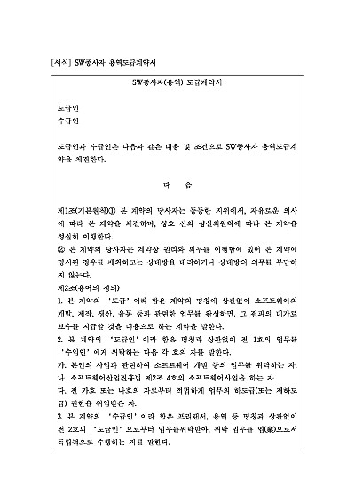 주요내용 : 업무범위, 계약기간, 보수, 보험가입, 도급인 및 수급인의 권리와 의무, 납품, 수령 및 검사, 재하도급급지, 비밀준수, 손해배상, 지식재산권의 귀속 등 내용 기재. 단 무단전재 방지목적으로 PDF 파일로 올리니, 구매하신 후 혹 원본 파일이 필요하신 분들은 톡이나 문자, 메일, 전화 등을 주시면 작성방법 등에 대한 간단한 무료상담과 함께 원본 파일을 보내드리도록 하겠습니다.