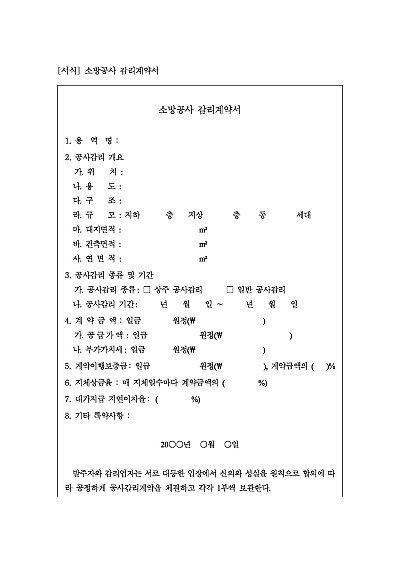 주요내용 : 공사명 및 장소, 착공 및 완공일 계약금, 대금지급방법, 계약이행보증금, 지체상금율, 대가지급 지연이자율 등 내용 기재 . 단 무단전재 방지목적으로 PDF 파일로 올리니, 구매하신 후 혹 원본 파일이 필요하신 분들은 톡이나 문자, 메일, 전화 등을 주시면 작성방법 등에 대한 간단한 무료상담과 함께 원본 파일을 보내드리도록 하겠습니다.