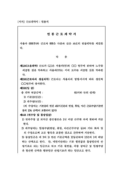 연봉계약서, 주요내용 : 고용걔약, 임금, 제수당, 지급방법, 기밀유지, 근로시간, 계약기간 등 내용 기재. 단 무단전재 방지목적으로 PDF 파일로 올리니, 구매하신 후 혹 원본 파일이 필요하신 분들은 톡이나 문자, 메일, 전화 등을 주시면 작성방법 등에 대한 간단한 무료상담과 함께 원본 파일을 보내드리도록 하겠습니다.