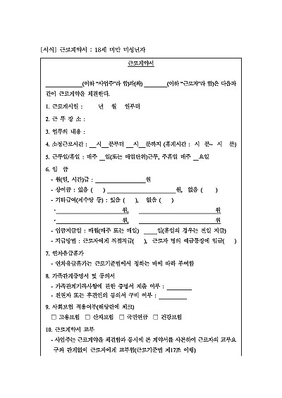 근로계약서, 미성년자 + 친권자 동의서, 주요내용 : 근로개시일, 근로시간, 업무내용, 휴무, 임금, 휴가, 가족관계증명서 및 동의서, 사회보험적용여부, 근로계약서 교부여부 등 내용 기재. 단 무단전재 방지목적으로 PDF 파일로 올리니, 구매하신 후 혹 원본 파일이 필요하신 분들은 톡이나 문자, 메일, 전화 등을 주시면 작성방법 등에 대한 간단한 무료상담과 함께 원본 파일을 보내드리도록 하겠습니다.