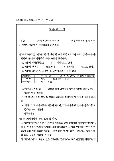 고용계약서, 연구소, 주요내용 : 고용조건, 지식재산권 관련 권리 및 의무, 비밀유지 및 기술정보 유출금지, 손배 등 내용 기내. 단 무단전재 방지목적으로 PDF 파일로 올리니, 구매하신 후 혹 원본 파일이 필요하신 분들은 톡이나 문자, 메일, 전화 등을 주시면 작성방법 등에 대한 간단한 무료상담과 함께 원본 파일을 보내드리도록 하겠습니다.