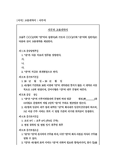 근로자 고용계약서 양식, 주요내용 : 담당업무, 근로기간, 임금, 근로시간, 근로장소, 보안유지 등 내용 기재 . 단 무단전재 방지목적으로 PDF 파일로 올리니, 구매하신 후 혹 원본 파일이 필요하신 분들은 톡이나 문자, 메일, 전화 등을 주시면 작성방법 등에 대한 간단한 무료상담과 함께 원본 파일을 보내드리도록 하겠습니다.