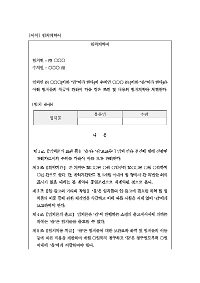 주요내용 : 보관, 계약기간, 입출고 등 작업,임치비용, 보험 등 가입, 손해배상 책임 등 내용 기재 . 단 무단전재 방지목적으로 PDF 파일로 올리니구매하신 후 혹 원본 파일이 필요하신 분들은 톡이나 문자메일전화 등을 주시면 작성방법 등에 대한 간단한 무료상담과 함께 원본 파일을 보내드리도록 하겠습니다.
