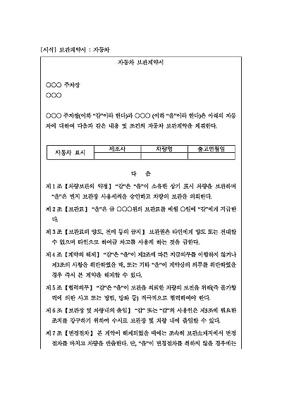 주요내용 : 보관료, 보관련 양도 등 금지, 계약의 해제, 협력의무, 보관장 및 차량내의 출입, 변경절차, 차량열쇠의 보관, 고의중과실에 기인하지 아니한 손해 등 내용 기재. 단 무단전재 방지목적으로 PDF 파일로 올리니, 구매하신 후 혹 원본 파일이 필요하신 분들은 톡이나 문자, 메일, 전화 등을 주시면 작성방법 등에 대한 간단한 무료상담과 함께 원본 파일을 보내드리도록 하겠습니다.