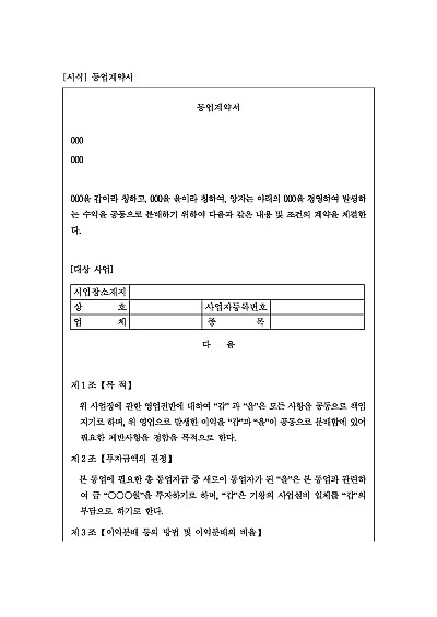주요내용 : 투자금액 결정, 이익배분 및 비율, 직원모집 및 유지에 관한 사항, 재료 등 구매결정 등 내용 기재. 단 무단전재 방지목적으로 PDF 파일로 올리니, 구매하신 후 혹 원본 파일이 필요하신 분들은 톡이나 문자, 메일, 전화 등을 주시면 작성방법 등에 대한 간단한 무료상담과 함께 원본 파일을 보내드리도록 하겠습니다.