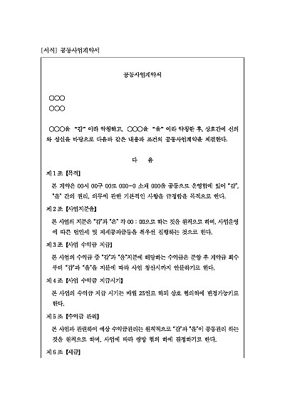 주요내용 : 지분익, 수익급 지급 및 지급시기, 수익금관리, 제세공과금 부담, 손실에 대한 책임, 공동사업 폐업 등 내용 기재. 단 무단전재 방지목적으로 PDF 파일로 올리니, 구매하신 후 혹 원본 파일이 필요하신 분들은 톡이나 문자, 메일, 전화 등을 주시면 작성방법 등에 대한 간단한 무료상담과 함께 원본 파일을 보내드리도록 하겠습니다.