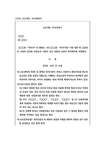 주요내용 : 사업범위, 업무분담, 투자의무, 수익배분, 선행조건, 신회사 설립금지, 보고 및 자료제출, 계약불이행 및 손해배상 등 내용 기재. 단 무단전재 방지목적으로 PDF 파일로 올리니구매하신 후 혹 원본 파일이 필요하신 분들은 톡이나 문자메일전화 등을 주시면 작성방법 등에 대한 간단한 무료상담과 함께 원본 파일을 보내드리도록 하겠습니다.