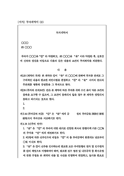 주요내용 : 투자금지급 및 신주인수, 투자금의 사용과 회계처리,이익배당, 주식양도, 주식양도 제한의 예외, 사업성과 보고, 영업상황 설명 요구권, 경업금지, 비밀유지의무, 계약해지 및 효과 등 내용 기재. 단 무단전재 방지목적으로 PDF 파일로 올리니구매하신 후 혹 원본 파일이 필요하신 분들은 톡이나 문자메일전화 등을 주시면 작성방법 등에 대한 간단한 무료상담과 함께 원본 파일을 보내드리도록 하겠습니다.