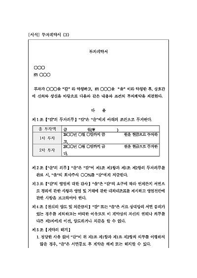 주요내용 : 투자금 및 투자기한, 을의 의무, 갑의 영업에 대한 감사,권리의 양도 및 처분금지. 계약해지, 비밀유지 등 내용 기재 단 무단전재 방지목적으로 PDF 파일로 올리니, 구매하신 후 혹 원본 파일이 필요하신 분들은 톡이나 문자, 메일, 전화 등을 주시면 작성방법 등에 대한 간단한 무료상담과 함께 원본 파일을 보내드리도록 하겠습니다.